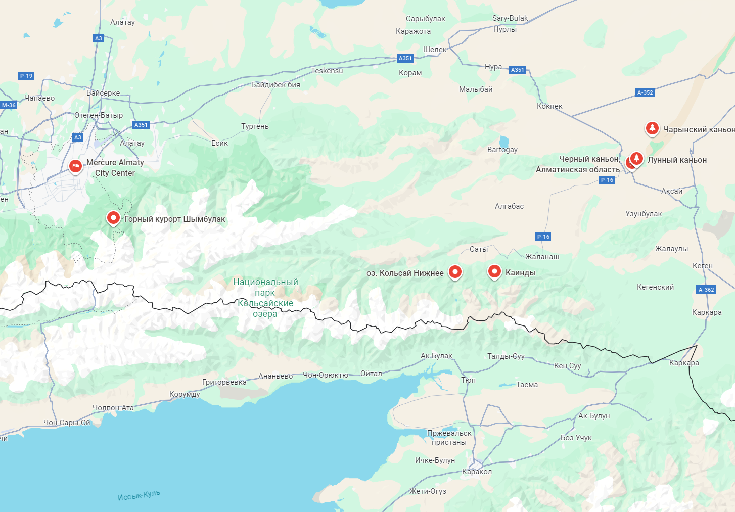 Локальные перемещения выглядели примерно вот так (максимально удаленная точки – это озеро Кольсай Нижнее, до которого почти 300км на машине):