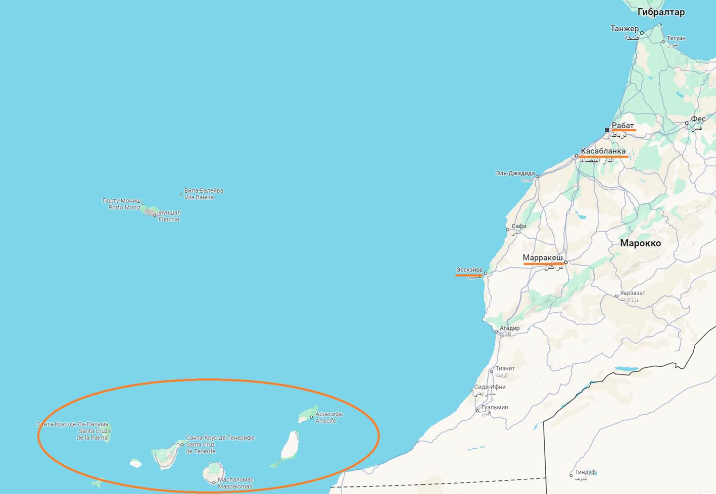 Если посмотреть немного левее, можно заметить Канарские острова, где мы уже были ранее. Прилетев в Касабланку, мы на поезде сразу отправились в Рабат, оттуда в Марракеш, съездили на автобусе в Эссуэйру одним днем, и за день до вылета вернулись в Касабланку на поезде. Поезда ходят очень часто, но я все же решил купить билеты заранее. Не знаю, чем это продиктовано, но зайти на сайт местных железных дорог можно только с французским IP, на что жаловались многие пользователи Reddit. Есть первый и второй класс, отличия которых очень сильно зависят от конкретного состава, а иногда и вовсе незаметны. Поезда вполне себе европейского формата, все составы французские, но большинство не первой свежести.